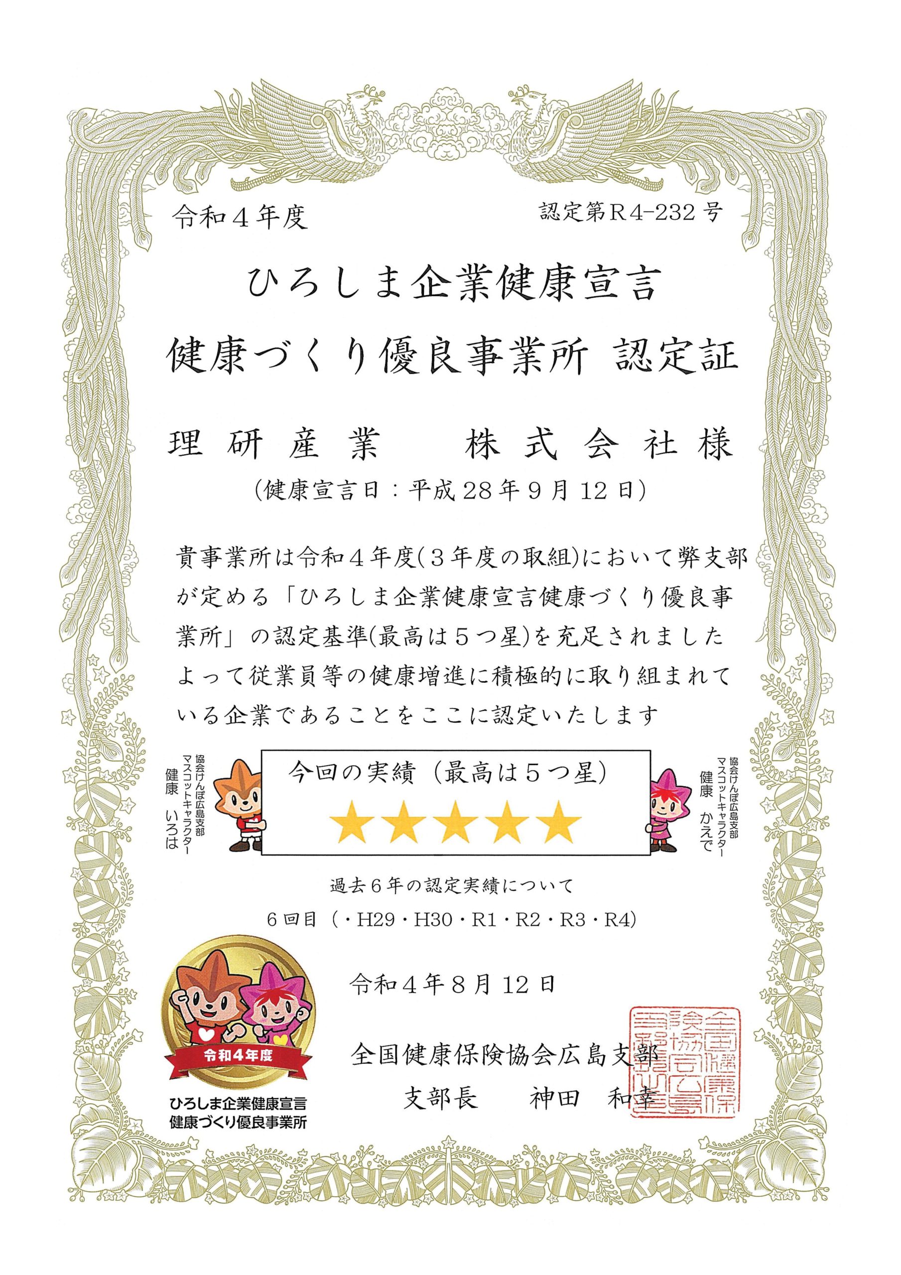 また、当社は全国健康保険協会広島支部の制度に賛同し2016年9月から「ひろしま企業健康宣言」にも参加しております。「5つ星認定事業所」に認定していただきました。今後も引き続き、社員がいきいきと働くことのできる会社づくりを進めてまいります。
