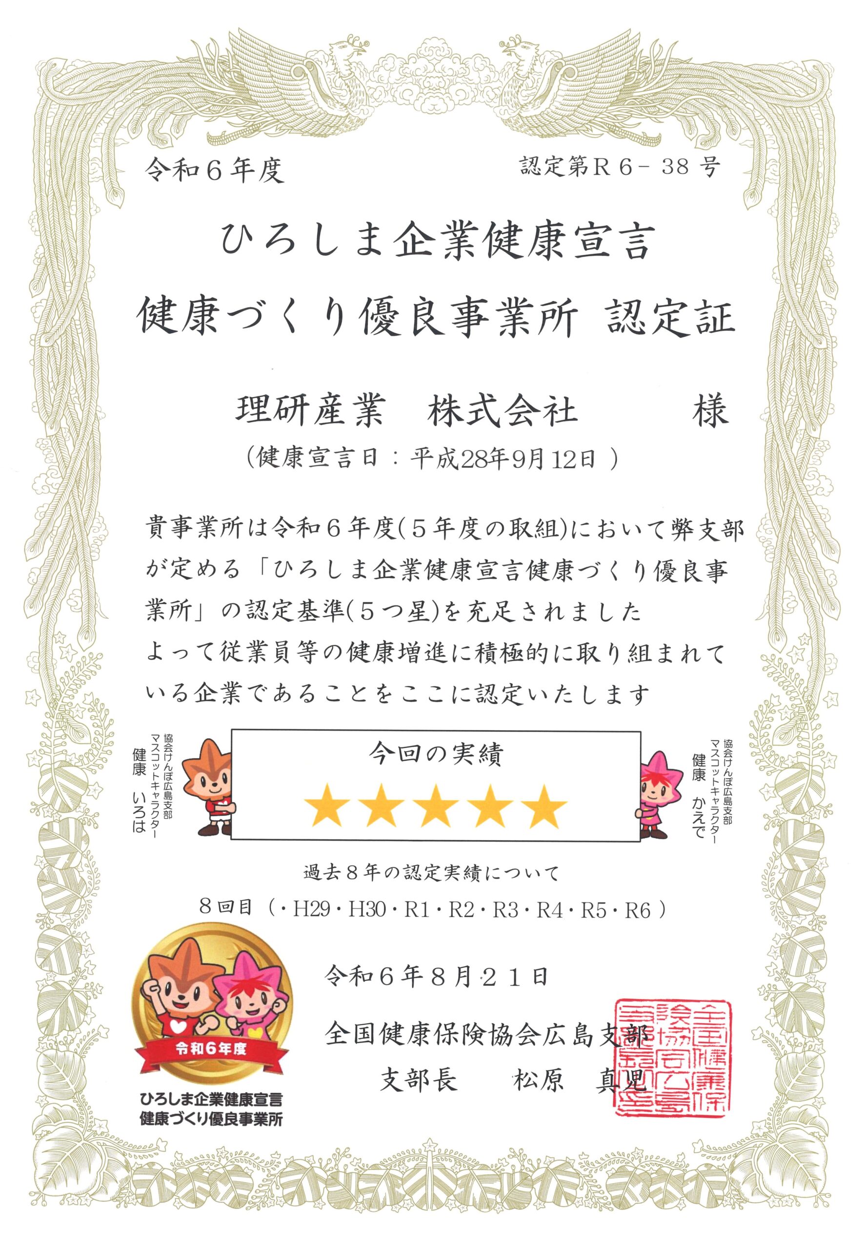 「ひろしま企業健康宣言」今年も5つ星の認定をいただきました