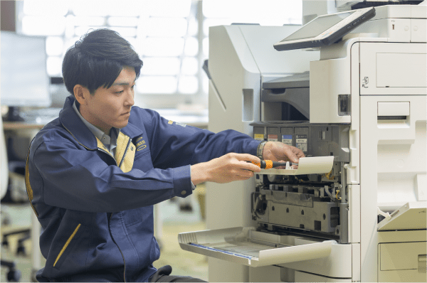 複合機の定期点検やICT機器の修理対応、ネットワーク設定、ソフトウェアのインストールなど、オフィス機器の面から、お客様の業務をサポートしています。常に新しい技術や知識を学び続けることが求められる仕事です。