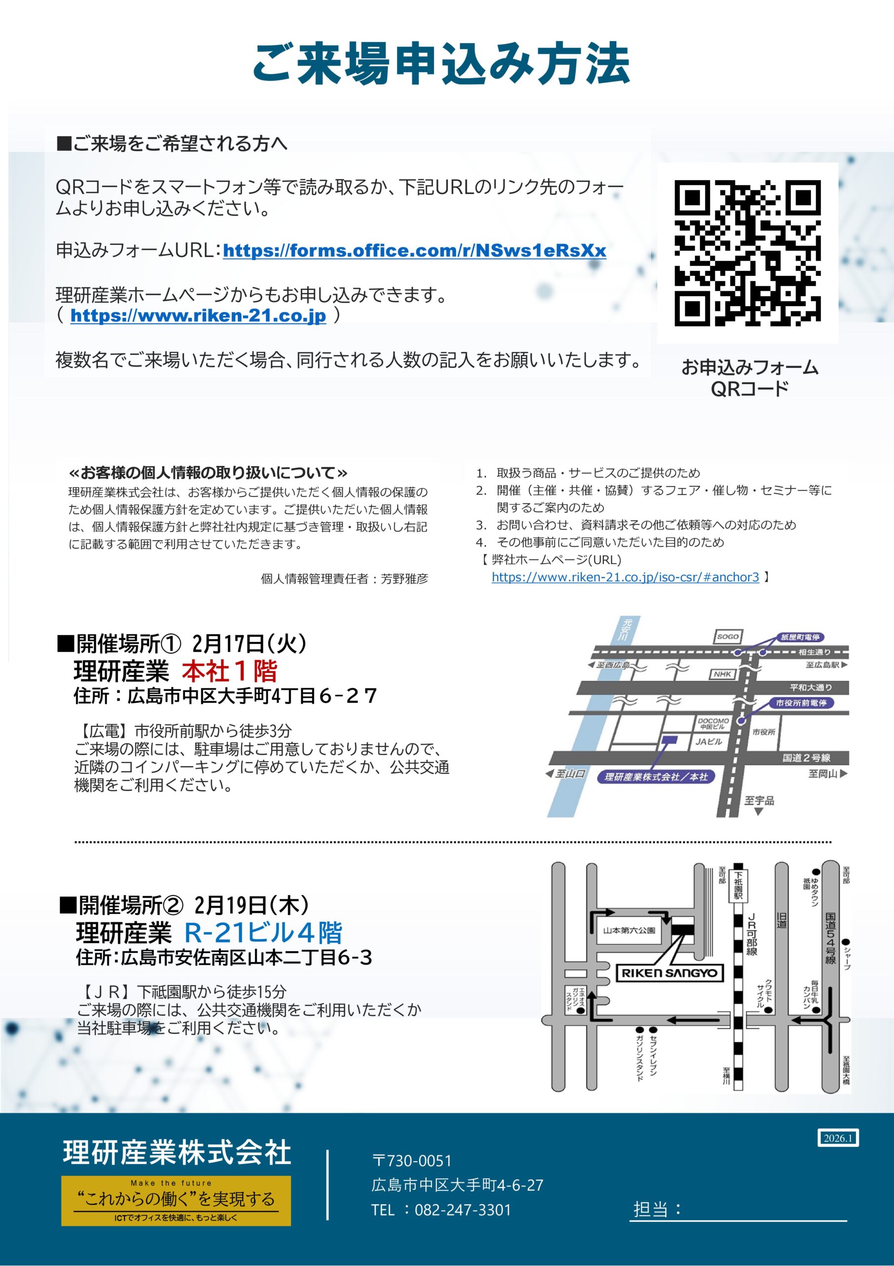 | 日時・場所 | 2026年2月17日(火)10:00~17:00(受付開始9:30/受付終了16:30) 理研産業 本社1階 住所:広島市中区大手町4丁目6-27 2026年2月19日(木)10:00~17:00(受付開始9:30/受付終了16:30) 理研産業 R-21ビル4階 住所:広島市安佐南区山本2丁目6-3 |